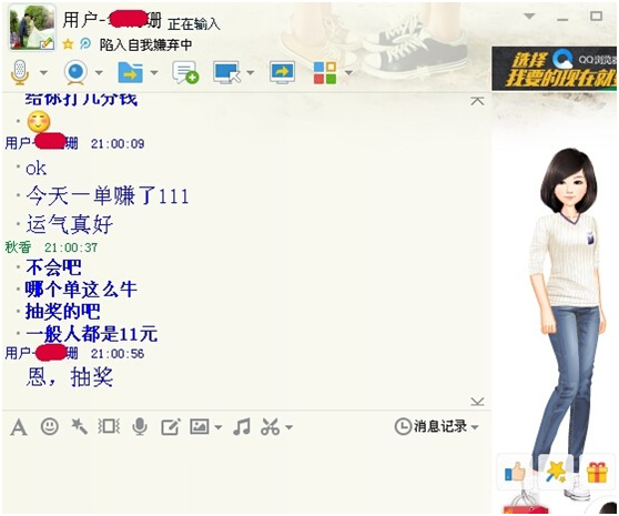 这是一个用户购买第一天给的一个反馈。她做了几个项目,其中有一个11元的任务,做完任务可以抽奖,百分百中奖,最少是11元,最多是1111元,这个妹子运气很好,抽了111元,刚花儿几百购买软件,几分钟的时间,几个月的年费赚回来了。当然,不是所有第一天购买软件的用户,都有这么好的运气,但是如果用心操作的话,两三天的时间赚回软件使用费也是很简单的。